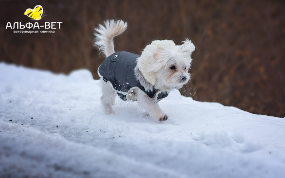 - Надевать водонепроницаемую утепленную одежду и обувь (если любимец отказывает от обуви, то обязательно использовать воск для лап).