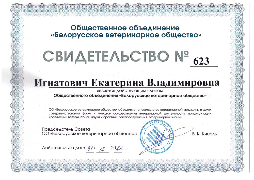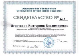 Действующий член "КОЛЛЕГИИ КАРДИОЛОГОВ" Общественного Объединения «Белорусское ветеринарное общество».