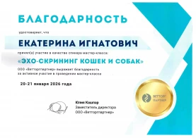 Игнатович Екатерина Владимировна - ведущий УЗ-диагност, кардиолог сети ветеринарных клиник «АЛЬФА-ВЕТ». Является основателем и ведущим лектором ветеринарной конференции «SEE MORE: ультразвуковая диагностика для ветеринарных врачей общей практики», которая проводится на базе клиники «Альфа-Вет».