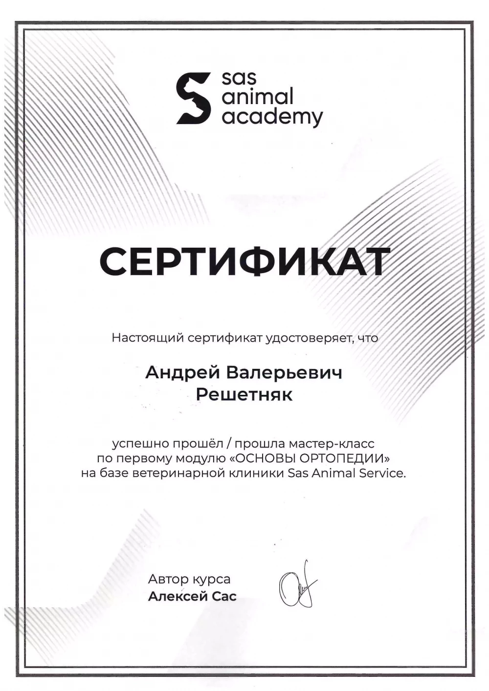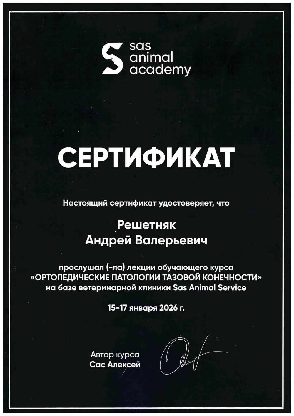 В 2022 году окончил курсы повышения квалификации и переподготовки кадров в УО «Витебская ордена «Знак Почета» государственная академия ветеринарной медицины» с присвоением специализации "ветеринарный врач - хирург".